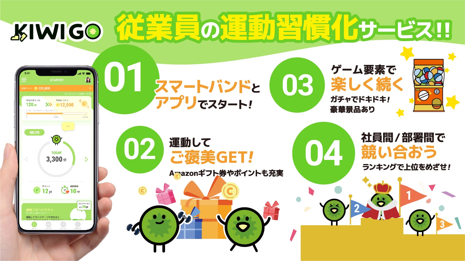 「KIWI GO」は、楽しく少しずつ従業員の運動を促し習慣化できる福利厚生ヘルスケアサービスです。コロナ禍における従業員の運動不足やコミュニケーション不足の課題を解決します。アプリとスマートバンドで運動を自動記録。運動でGETしたコインは、ドリンクやお菓子、Amazonギフトカードなどのごほうびと交換できます。行動科学に基づいた仕組みで無理なく運動を続けるとともに、従業員同士のコミュニケーションも活性化。