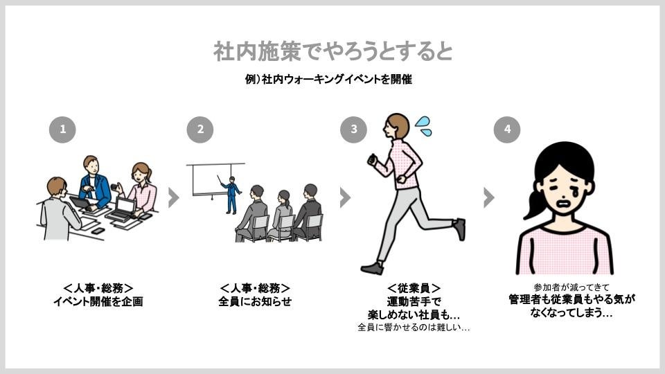 運動の意識が低い人は、ひとりで運動することや運動イベントへに参加することはハードルが高いと感じます。